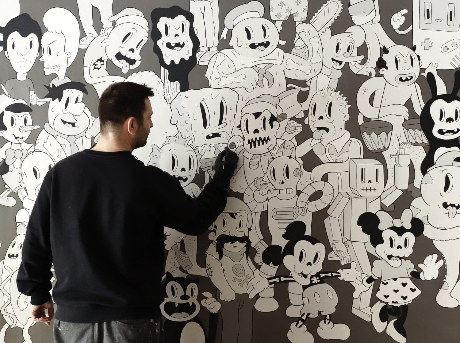 Первое, что бросается в глаза: он лишает персонажей насыщенности, буквально, рисует их ахроматическими. В этом жесте одновременно сочетается еще один малоизвестный опыт работы художника тату-мастером и отсылка к старым черно-белым диснеевским мультфильмам 1920-х годов. Насвистывающего свою песенку Микки Мауса за штурвалом “Пароходика Вилли” Эскрива скрещивает с бодро дёргающимися мешками костей из “Танца скелетов”.
