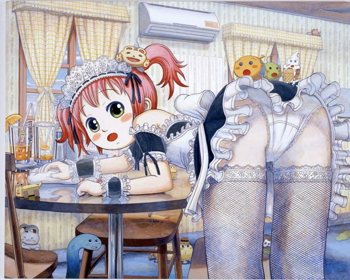 Лоликон создает обманчиво инфантильный женский образ. Поскольку там, где возникает одержимость чем-либо (или кем-либо) всегда есть какая-то пустота, пробел, нереализованность, которые компенсируется объектом аддикции. С этой позиции уязвимым является тот, кто является потребителем, а не тот, кто поставляет желанное с обратной стороны экрана. Эта парадоксальная смена ролей зачинается уже в первых работах Mr., которые упоминались ранее. Неосуществленное желание взаимодействия и приближения к молодой девушке разворачивается по итогу в избегание, которое художник умело маскирует как легкое недоумение или смущение. На деле – обыкновенный стопор благоговения. Власть передана женской фигуре, какой бы невинной и малой (буквально) она не изображалась.