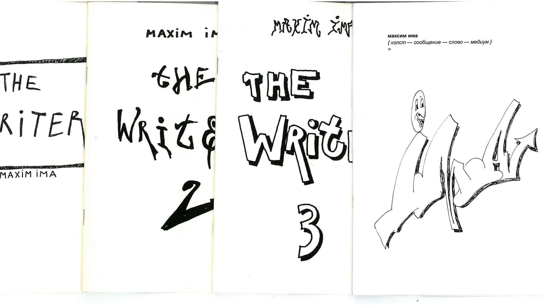Это еще (или уже) не дикий стиль, где надпись становится не читаема даже другими райтерами, не то, что можно уверенно охарактеризовать одним стилевым направлением. Непонятный и странный, или следуя цитате автора — “абстрактный и уродливый”, стиль Максима не был похож на то, что делали коллеги по цеху. Эта нетипичность почерка объясняется еще и тем, что классический путь развития от граффити надписей к пост формам граффити Имой был перевернут: текстовые структуры выстроятся в его практике лишь после того, как подостынет адреналиновая горячность от того самого первого опыта покраса, от момента выброса краски из баллона, от того, как поверхность поддается напылению краски и изменяется с каждым новым нажимом на кэп. Любовь к рисовательной практике, к материалу, к живописи, как к медиуму, позволяющему высказаться — то, что часто упускают в разговоре об уличном искусстве. Романтизация субкультуры — последнее, из ассортимента эффектов, которых хотелось бы достичь, но не заметить заложенную страсть к процессу рисования, о которой сообщают многие авторы уличных произведений, в том числе и Има, кажется еще большим упущением. В разворачивающемся далее куске автор решает исчерпать лимит использования слова “медиум”, постепенно намечая на полях переменные заданного уравнения.
