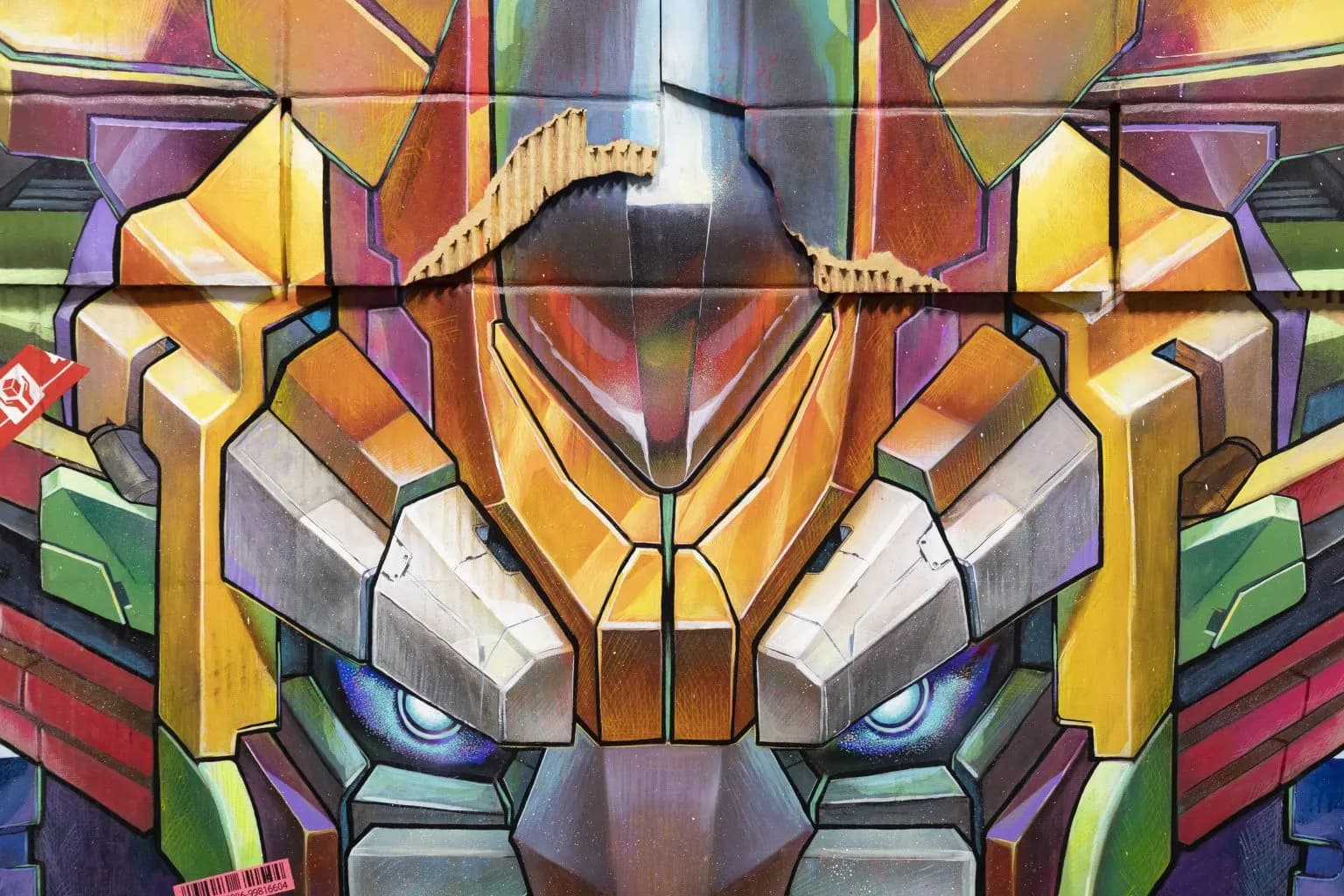 Привлекательность — одно из ключевых понятий, которые исследует TengaOne. Неслучайно художник называет одну из своих последних выставок “Больше, чем кажется на первый взгляд” (“More than meets the eye”). Первое, что вылавливается глазом — до боли знакомые персонажи из всевозможных поп-культурных источников. Супер-роботы в полный рост, похожие на олдскульных трансформеров Майкла Бэя, их микроскопически детализированные маски, помещенные в тондо, словно в чашки петри. (В качестве досуга проведите параллельный визуальный затест с эклектичными скульптурными масками Димы Шабалина.)